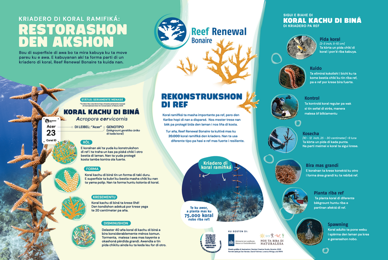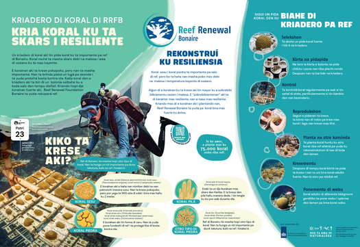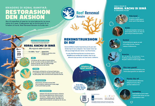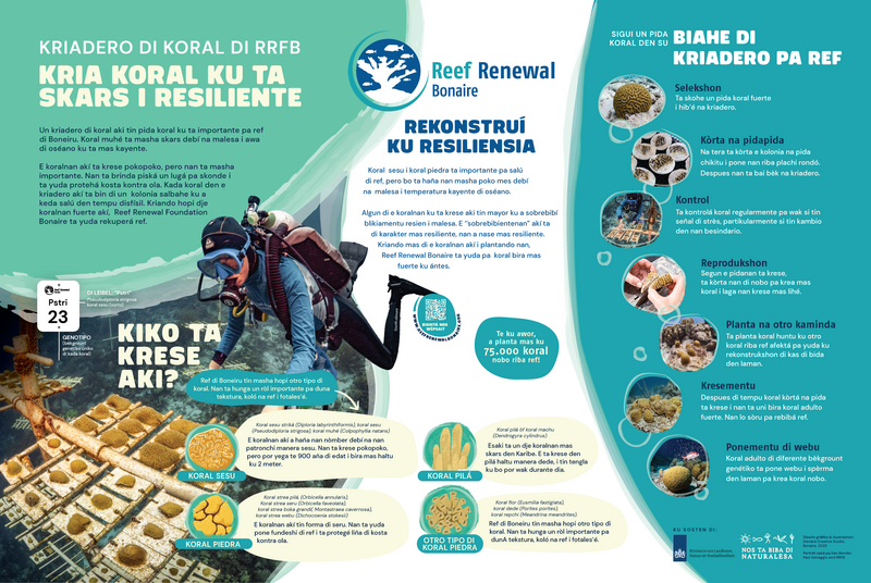 Ref di koral ta protehá nos kosta, e ta atraé turista i e ta forma e fundeshi di bida den laman. Pero Boneiru su refnan ta konfrontando hopi problema. Debí na kambio di klima, daño di tormenta i polushon, netamente e espesienan ku nos tin mas mester di dje ta disparsé. Restorashon no ta un luho, sino un nesesidat. Sierto koralnan (prinsipalmente esunnan ku brasa) ta krese rápidamente si nos yuda nan. Pa medio di kultivá nan na un manera dirigí i planta nan di nobo, nos ref ta haña un chèns nobo. I ku kada kolonia, resiliensia di nos isla tambe ta krese.